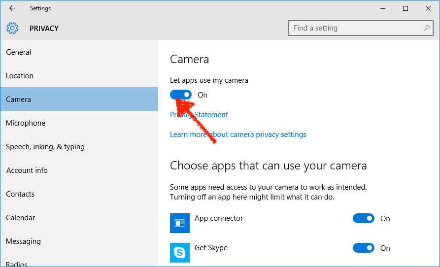 In Windows viii and 10, you tin can disable your camera through your privacy settings. Open the new Settings pane from your Start carte, select Privacy then choose the Camera tab. Y'all can turn your photographic camera off entirely, or but disable specific apps from accessing your camera.